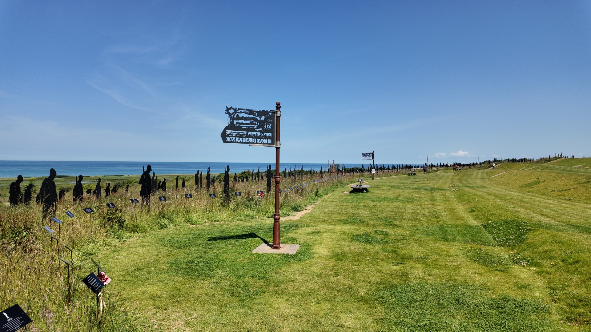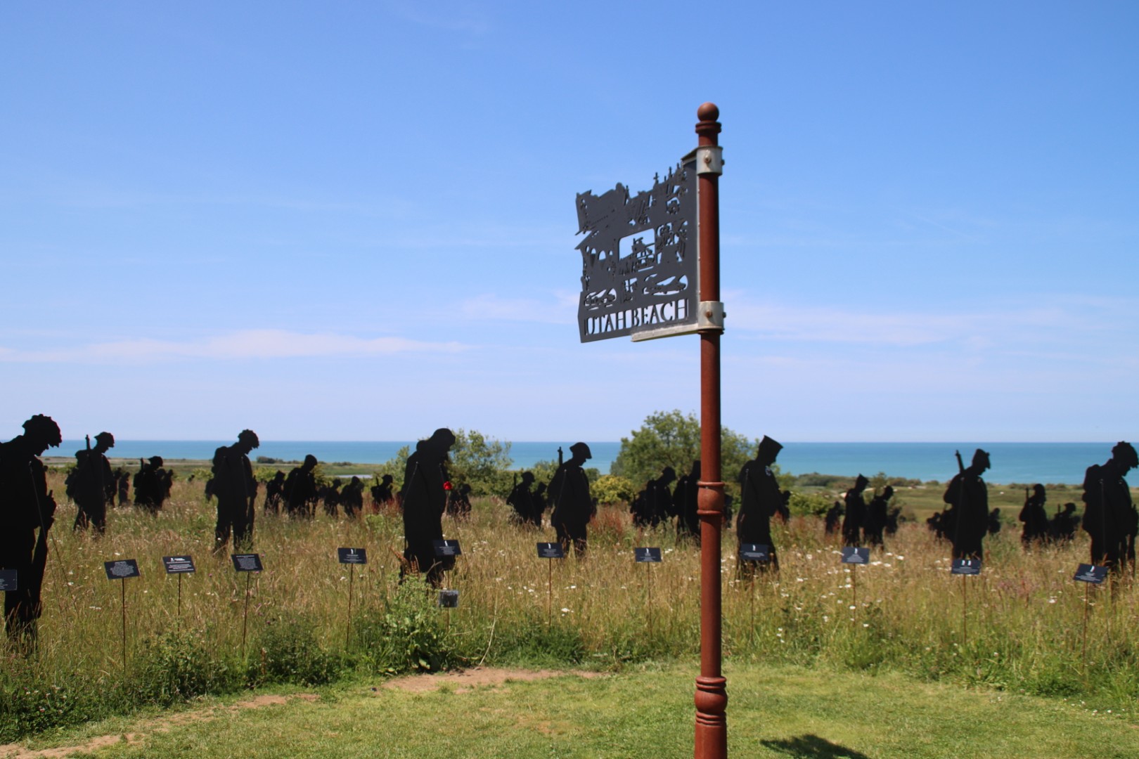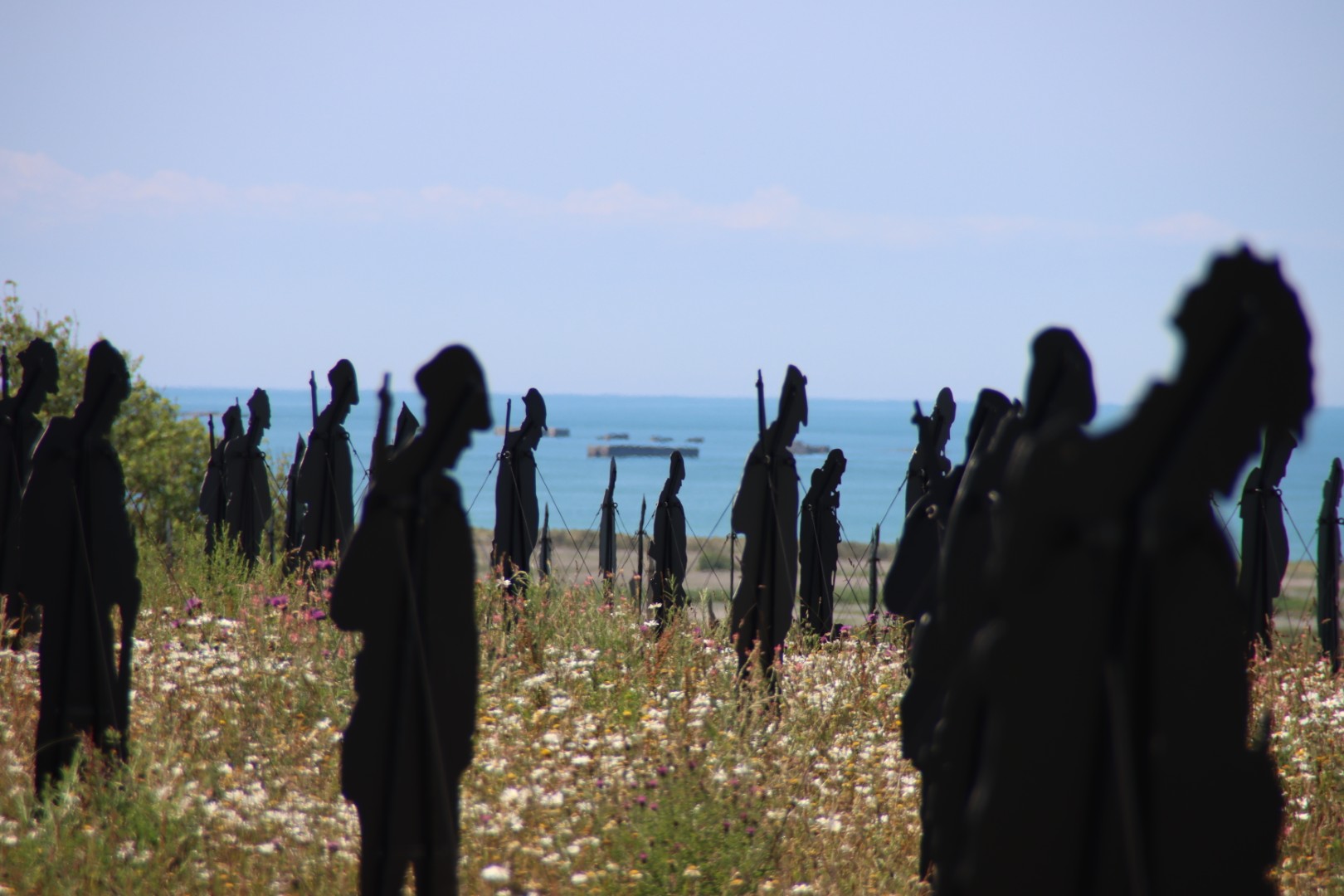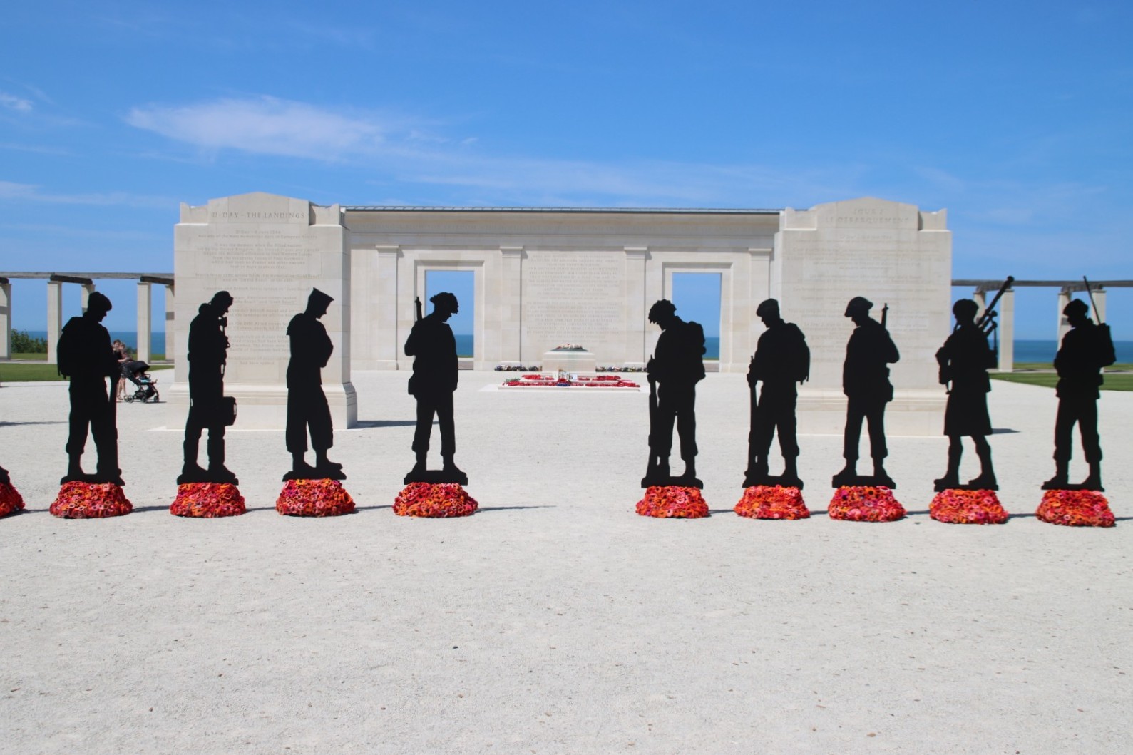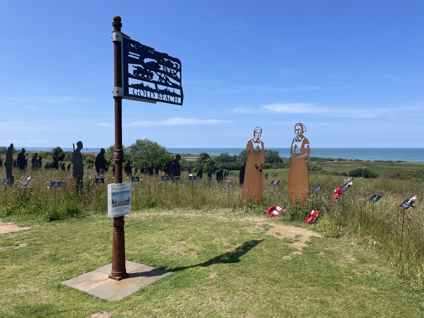 Standing with Giants is a temporary art memorial installation consisting of hundreds of life-size silhouettes of soldiers and other military personnel. These figures are positioned in the grassy area surrounding the memorial, mostly facing the sea (Gold Beach), at the location where British troops landed and made their sacrifices on D-Day, June 6, 1944.