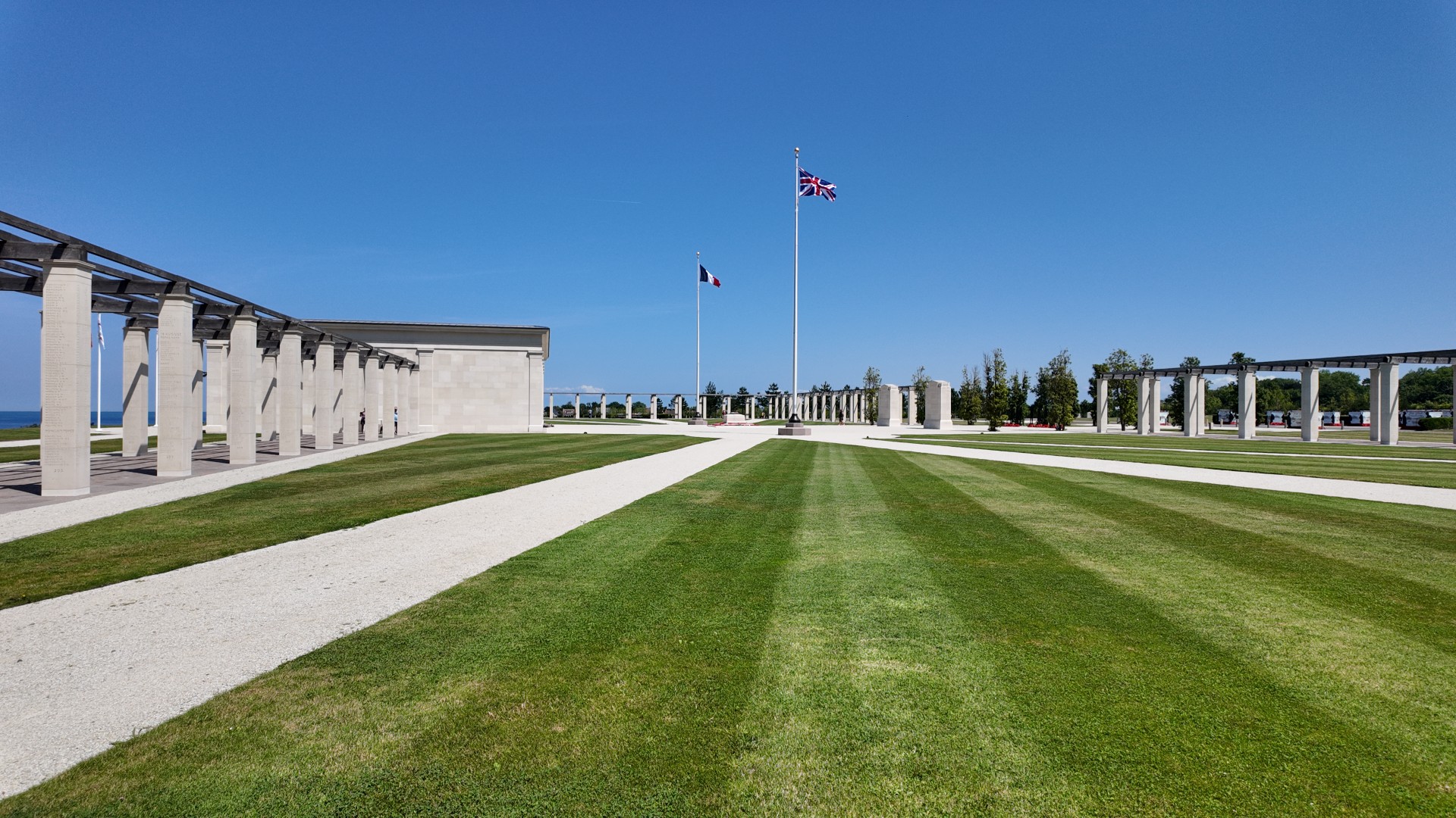 1) British Normandy Memorial: The British Normandy Memorial is a memorial in Ver-sur-Mer. It commemorates the 22,442 British and British Special Forces troops who fell during D-Day (June 6, 1944) and the Battle of Normandy (until August 31, 1944). Their names are engraved on 160 white pillars, arranged by date of death. It is the only memorial in Normandy where all the names of the British landing section "Gold Beach" are listed together. From the monument, there is a panoramic view of the sea and the beaches, allowing visitors to literally look out over the place where history took place. Flags and information panels also refer to other landing beaches such as Omaha and Utah Beach, to demonstrate the joint Allied effort. The memorial opened on June 6, 2021, and serves as a central place of remembrance, reflection, and education about Britain's role in the liberation of Europe. Admission to the memorial is free.