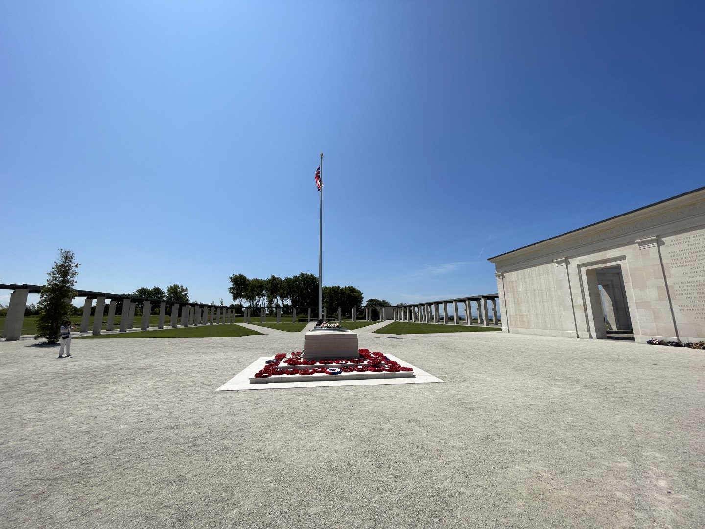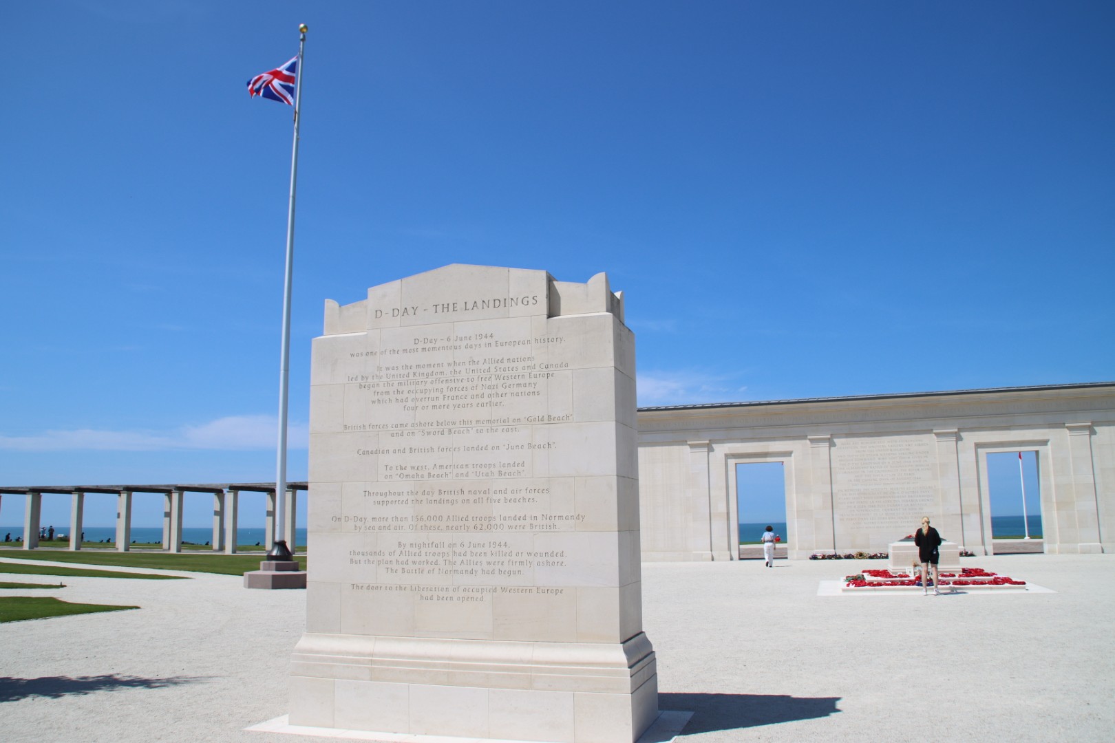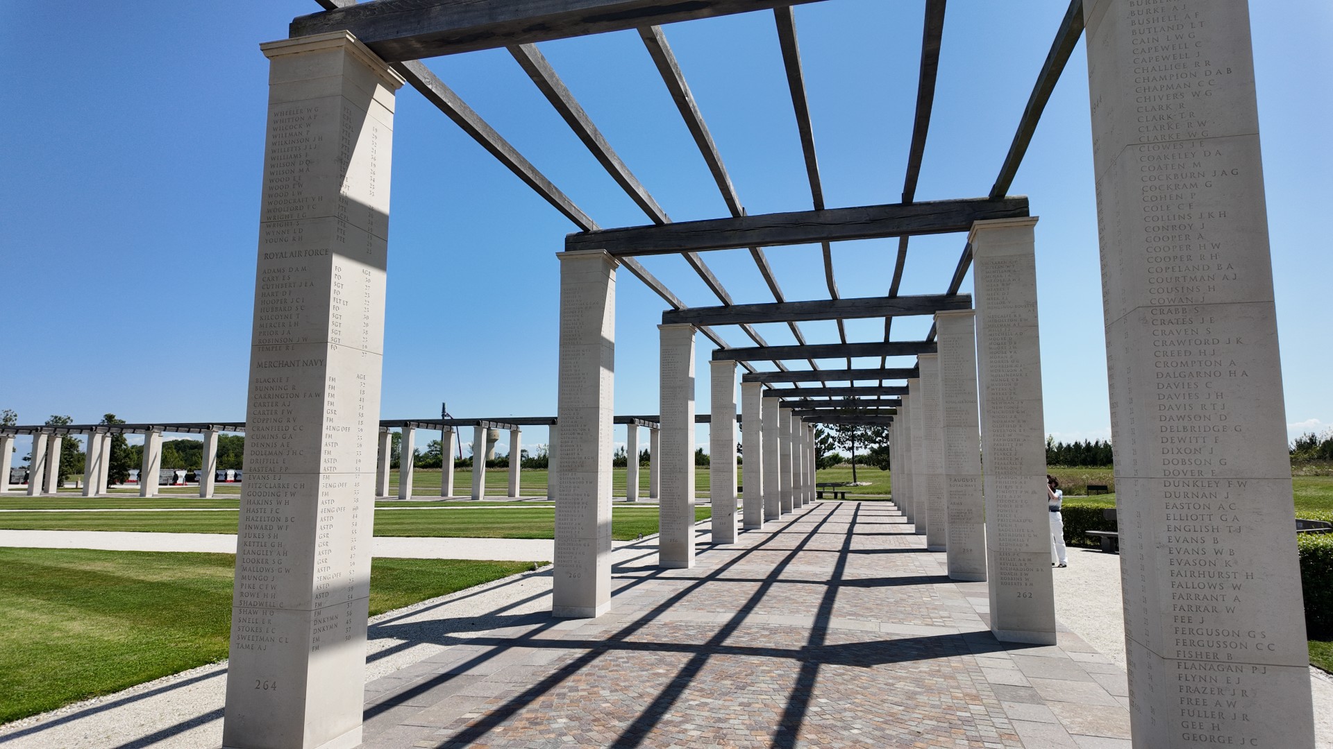 Around the central "D-Day - The Landings" memorial stand 160 white pillars engraved with the names of the British and Commonwealth soldiers who died during the Battle of Normandy in 1944.
