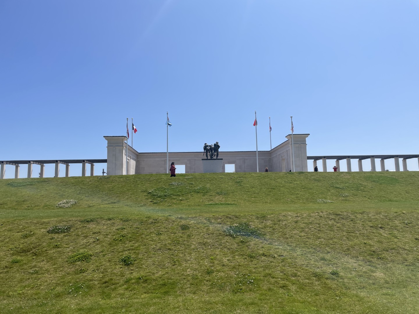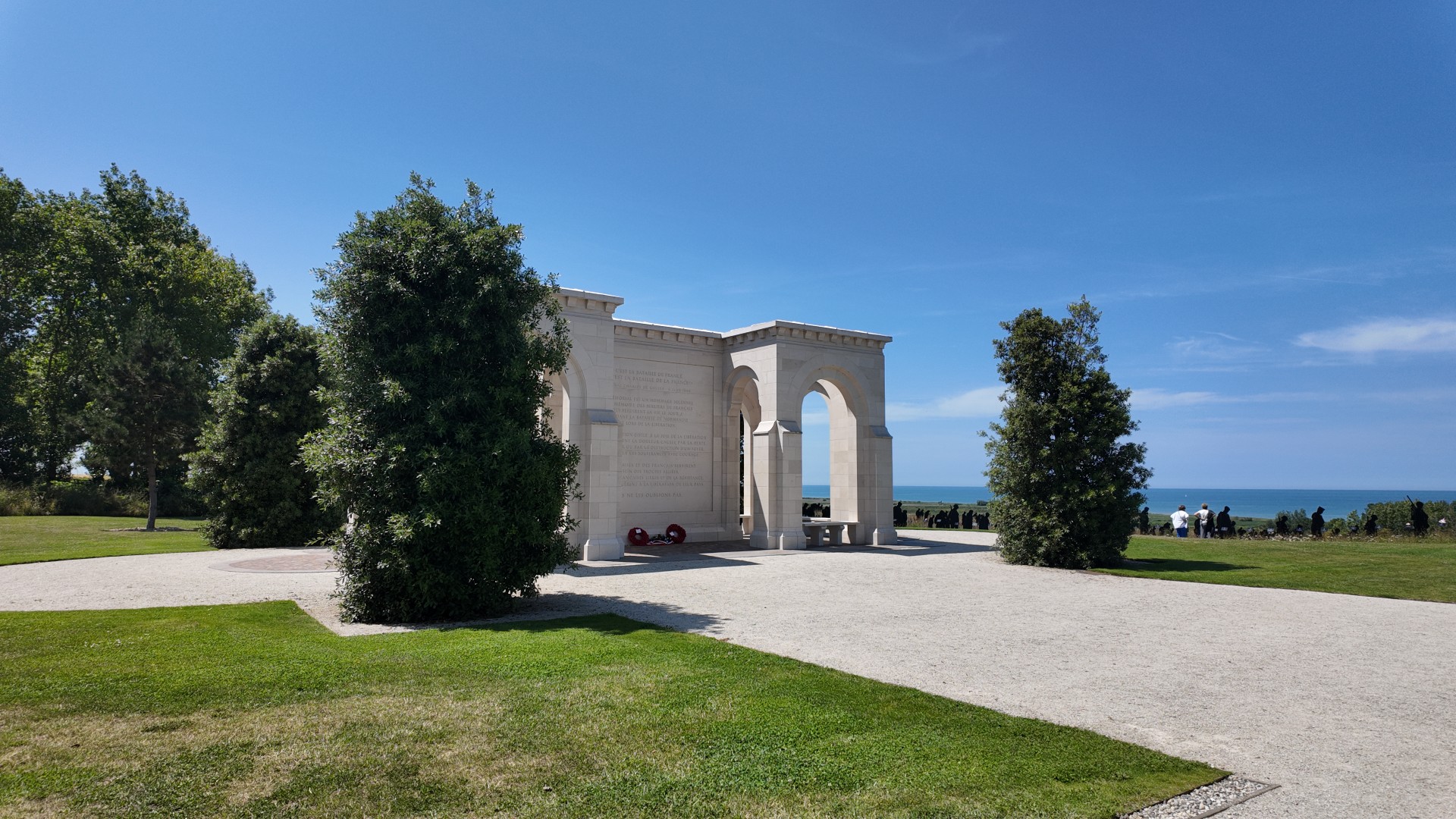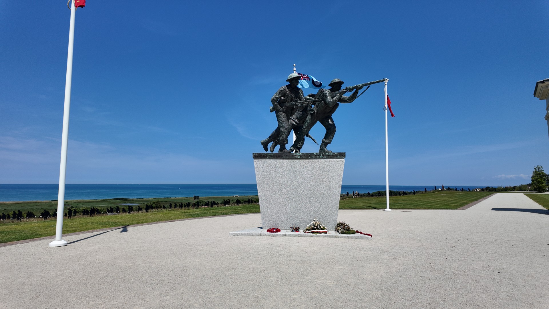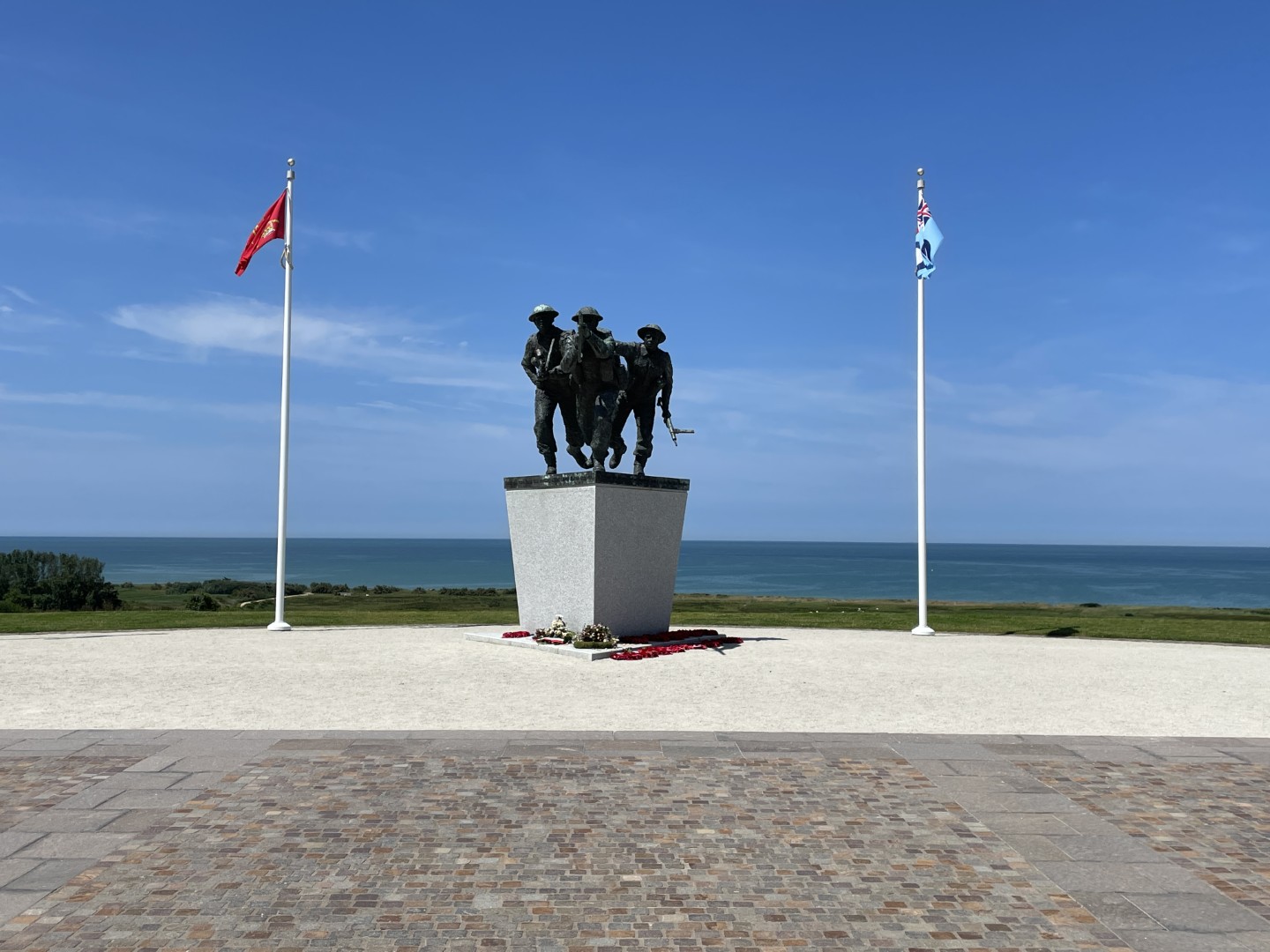 The monument is located on a hill in Ver-sur-Mer, directly above Gold Beach, the beach where British troops landed on D-Day. From the central plaque and the statue of the three soldiers, you can literally look out over the sand and sea where thousands of soldiers launched their attack.
