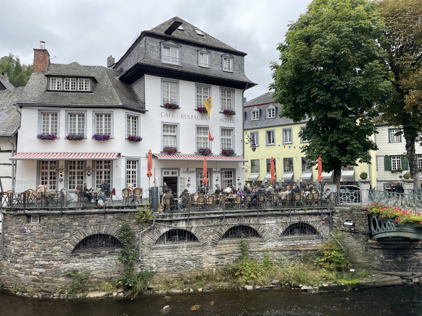 Around the beautiful part of Monschau, there are many cozy restaurants, cafes, and various eateries. You can often sit right by the water or in the quiet streets.
