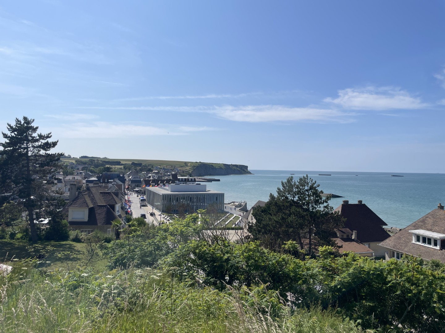 Vanaf Jardin du Souvenir heb je een prachtig uitzicht op Arromanches-Les-Bains en het kanaal.