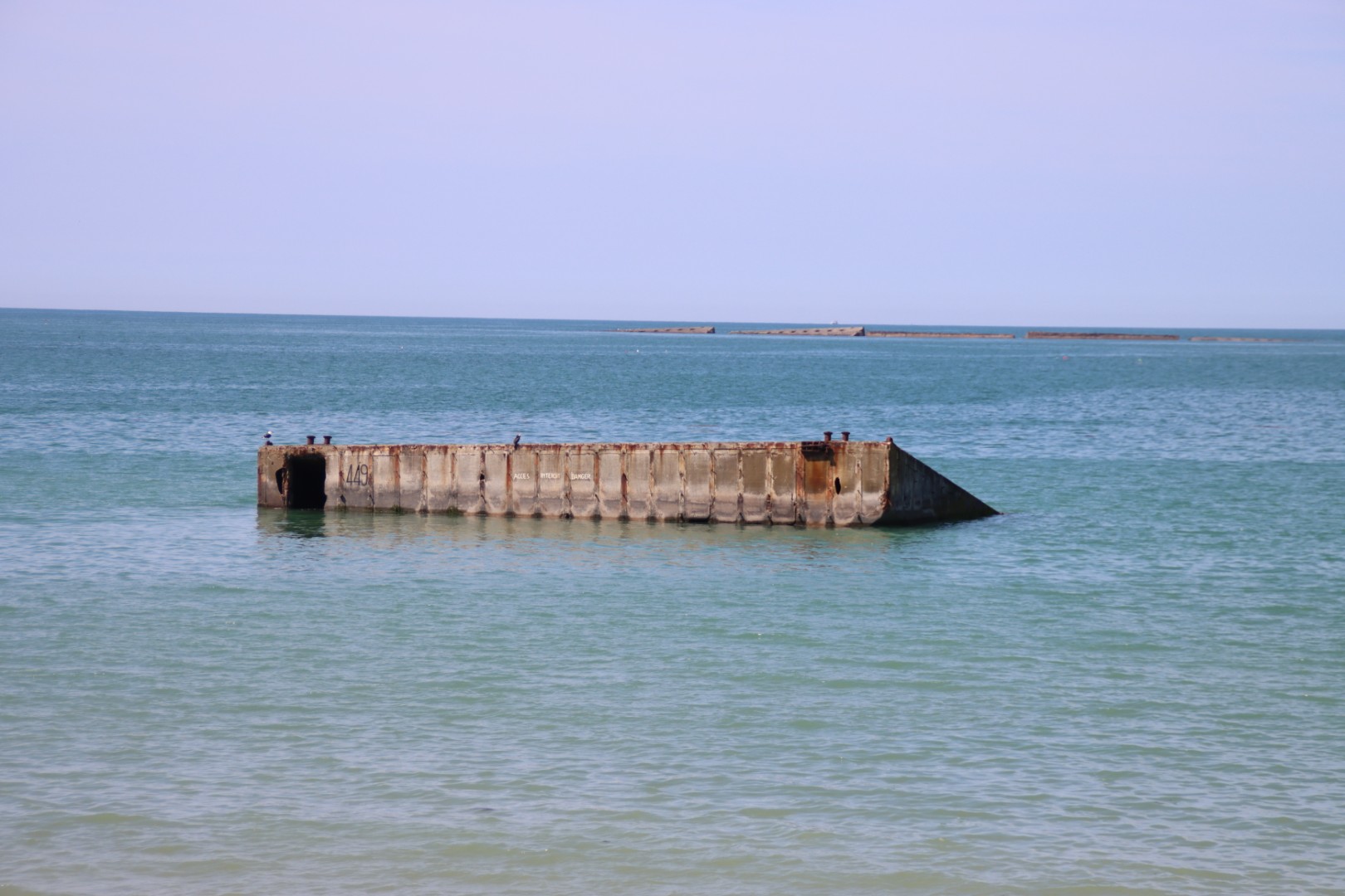 The 449 concrete caissons were a spud pier / pontoon pier: a floating jetty with legs (spuds) that could sink into the seabed so that the pier remained stable during high and low tides. The pier served to transfer goods, vehicles, personnel etc. between the floating pontoons (or ships) and the floating roads ("Whale roadways") to the shore. Pontoon 449 was therefore an essential part of Mulberry B's logistical infrastructure, as a link between the sea and the beach.