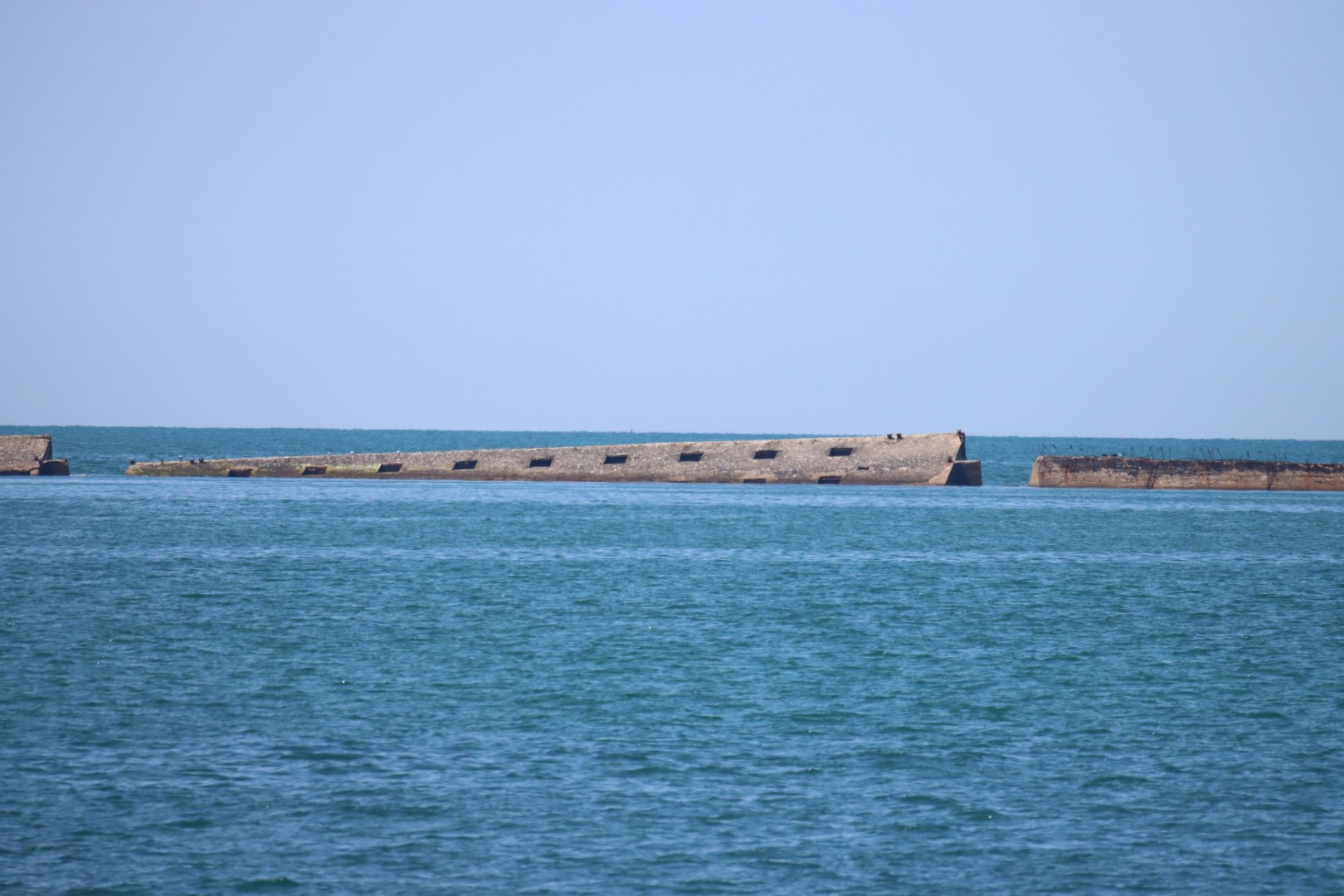 The massive concrete caissons (hollow blocks) were built in England and towed across the Channel. They were sunk to form a breakwater. Many of these caissons are still visible in the sea, especially at low tide. Each caisson is tens of meters long and weighs thousands of tons.