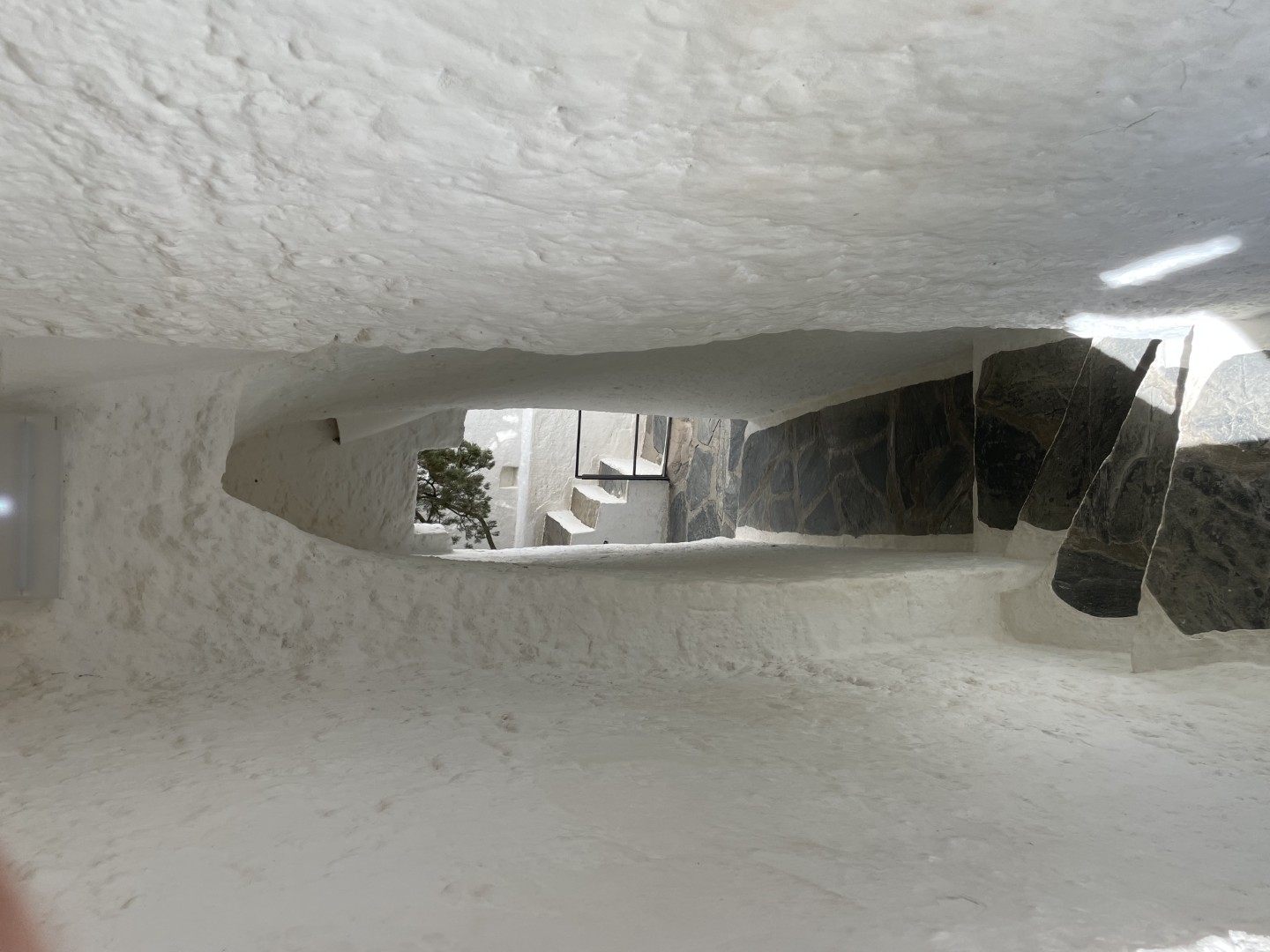 The covered seating area by the pool, with cushions, is usually seen as a place of rest and reflection. Dalí loved light but not extreme heat and physical exertion.