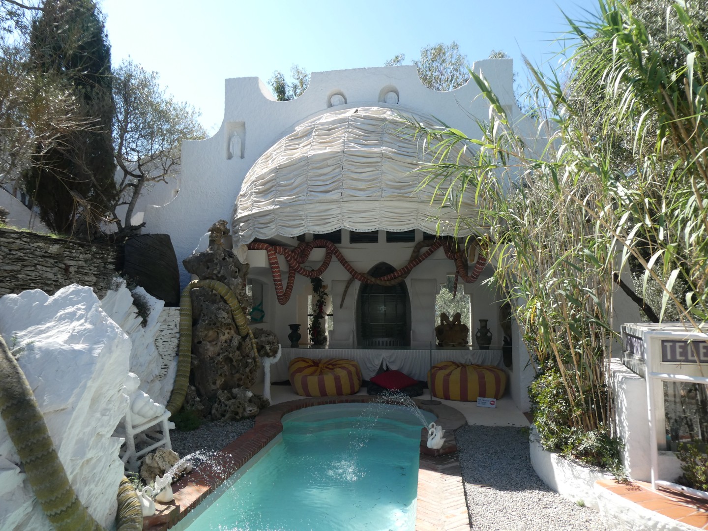 De overdekte zithoek bij het zwembad met zitkussens wordt meestal gezien als een rust en denkplek. Dalí hield van licht maar niet van extreme hitte en fysieke inspanning.