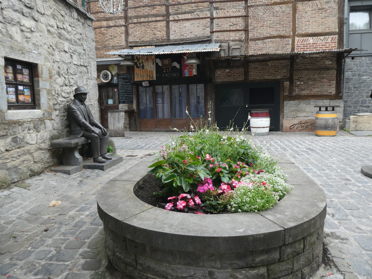 Op Rue des Récollectines staat een prachtig beeld van een man wachtend op een bankje (zie film).
