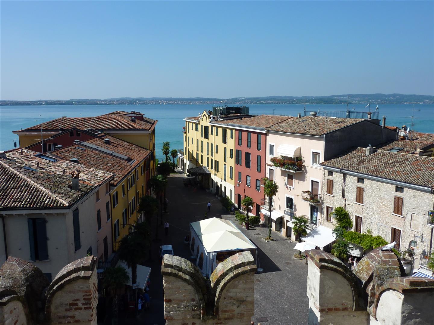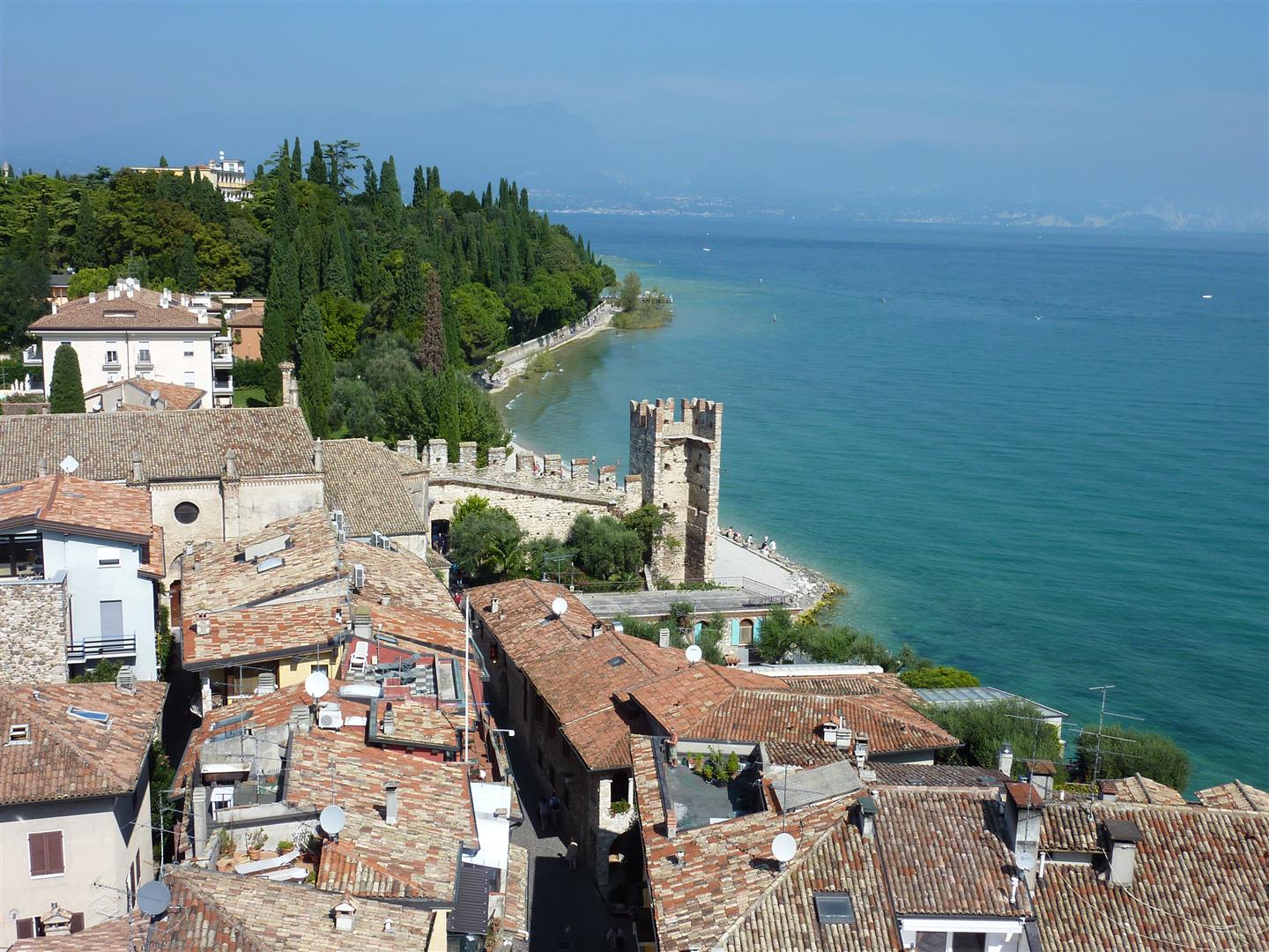 Het stadscentrum bestaat uit een wirwar van smalle steegjes waar het heerlijk slenteren is langs de kleine winkeltjes en talrijke ijssalons met zalig Italiaans ijs. Uitzicht vanaf het kasteel op het plaatsje Sirmione.