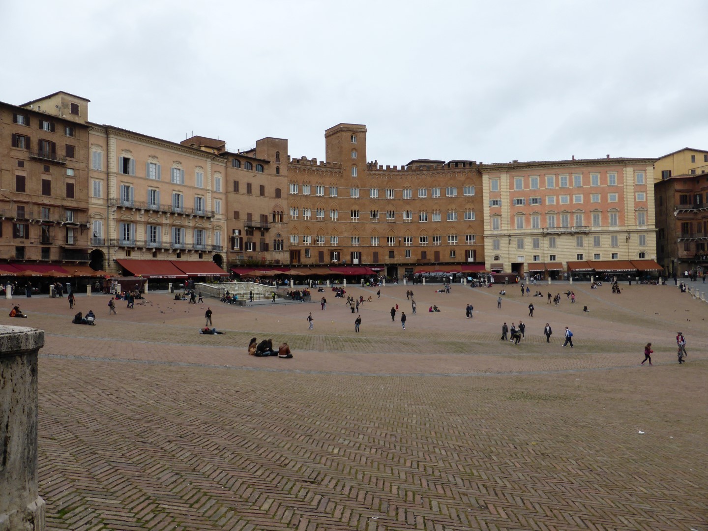 Vanuit dit centrum is het plein, waaiervormig, ingedeeld in 9 segmenten, als dank en herinnering aan het bestuur van de 'Raad van Negen' (Sieneense gilden) die de stad tussen 1287 en 1355 bestuurden. Dit is te zien aan het karakteristieke plaveisel, gelegd in 1347, dat bestaat uit rood baksteen afgewisseld met lichte stroken kalksteen.